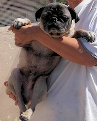 Hause. Er und der kleine Mops Luigi sind bereits unzertrennliche