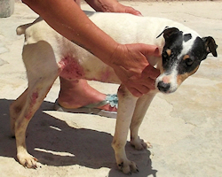 Hierbei war er zwar wehrhaft, aber dennoch ziemlich erfolglos, und so war es sicher für diesen Hund mittleren Alters eher eine Erlösung, dass ihn die Hundefänger von der Straße "gefischt" und einer Tierauffangstation zugeführt haben. Ihm geht es jetzt recht gut, und außer seinem anfangs total "zerbeulten" Äußeren fehlt ihm eigentlich nichts. Er ist mobil und dank medizinischer Versorgung, ausreichend Futter und Trinkwasser gut gelaunt und genießt seine Rundum-Versorgung. Die Haut heilt ganz deutlich, wenn auch langsam.