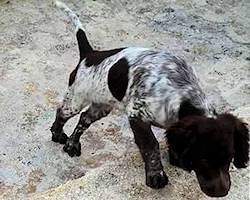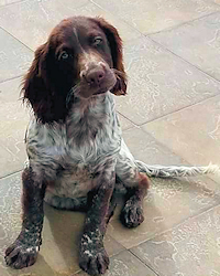 Die Mutter ist ein English Springer Spaniel und der Vater gehört vermutlich einer anderen, uns leider unbekannten, passenden Jagdhunderasse an. Eventuell war er ein Kleiner Münsterländer oder ein Deutsch Kurzhaar, oder selbst ein Mischling.