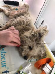 Doch das war nicht alles - der kleine Schatz wor von oben bis unten voller Flöhe und Zecken, so dass seine Haut stellenweise ganz schwarz ausgesehen hat. Was muss er für Qualen erlitten haben, und wie lange muss er schon so ganz alleine draußen herum gestreunert sein ?