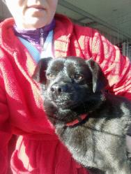 Irgendwo in ihrer Ahnentafel findet sich vermutlich ein schwarzer Mops. Von dem hat sie die etwas verkürzte Nase, die breite Brust, die Schulterhöhe und das tolle rundum schwarze Fell ohne jegliche Zeichnung. Ähnlich stur wie diese ist sie aber nach unseren Erfahrungen nicht ...
