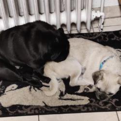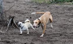 Unser kleiner Mops-Mix-Mädchen Erna lebt seit ein paar Wochen auf einer privaten Pflegestelle in Bayern. Dort war sie eigentlich eingezogen, um für die "wilde Hummel" Olga, Mops, schwarz, ein Spielfreund zu werden. Nun sind die bdeiden tatsächlich ein agil spielendes Paar geworden, jetzt ist Erna, die in der Pflegestelle Frida gerufen wird, mittlerweile so gut aufgewacht, dass sie die wilde Hummel außer Atem spielt und Olga dann schon schnaufend in die Kissen fällt. Frida hat dann immer noch nicht genug, und so hat sich unsere Pflegestelle schweren Herzens dazu entschlossen, sich von Frida wieder zu trennen - und das ist eigentlich sehr schade, denn Frida ist sehr auf ihr Pflegefrauchen fixiert und hört gut. Sie darf inzwischen unangeleint in sicherem Gelände toben und kommt sofort, wenn sie gerufemn wird. Sie tobt am liebsten mit Galgos (!!!), die sie gerne scheucht und die dann eher außer Atem sind als sie.