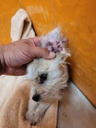 Der erste Überblick ergab eine Vielzahl von Zecken, die sich im Ohr und am Körper der Kleinen festgesetzt hatten, also direkt ab zum Tierarzt, Zecken entfernen und den armen kleinen Körper baden. Wilma ließ sämtliche Prozedur klaglos über sich ergehen. Am Ende war sie frisch frisiert, an einigen Körperstellen kahl geschoren, aber guter Dinge und sehr zufrieden, dass sie die elenden Plagegeister los geworden war. Nach Chip und Impfung durfte sie dann in die Welpengruppe im Tierheim umziehen, wo sie sich nun von all den Strapazen erholen kann, die ihr in ihrem kurzen Leben bisher widerfahren sind. Ausschlafen, gutes Essen und nette Hundefreunde tun dann ihr übriges, so dass wir für die kleine Maus demnächst sicher ein schönes, liebevolles neues Zuhause finden werden, wo sie um ihrer selbst willen geliebt wird und ein artgerechtes Hundeleben führen kann. Die Haare wachsen schon nach, und da unsere Hunde sowieso im <jetzt und heute> leben, sollte es nicht schwer sein, für die kleine süße Maus ein passendes freies Körbchen mit lebenslangem Bleiberecht für immer zu finden.
