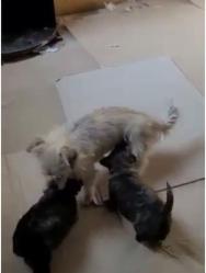 Die kleine Mitzi lief unserem Tierheimleiter eines Abends quasi vor das Auto, als er sich auf den Weg nach Hause machen wollte. Er sah ihre Not, nahm sie mit ins Auto und nach Hause. Dort gab es zunächst etwas zu futtern, Wasser und einen gemütlichen Schlafplatz. Als er dann am nächsten Morgen mit ihr zum Tierarzt wollte, stellte er fest, dass sie ein ausgeprägtes Gesäuge hatte – sie musste Welpen gehabt haben. Also fuhr er mit ihr an die Stelle zurück, wo er sie aufgefunden hatte. Mit einer Art Schleppleine ausgestattet, führte ihn die brave Mitzi tatsächlich auf einen Schulhof, wo sie ihre zwei Welpen versteckt hatte. Bei Nachfrage stellte er fest, dass dort eine tierliebe Lehrerin und der Hausmeister für die kleine Hundefamilie in einer entlegenen Ecke eine Art <Nest> gebaut hatten – eine Hundehütte diente als Unterschlupf, und gefüttert wurden sie dort auch. Allerdings hatte man dort mittlerweile große Angst, dass die Welpen mit zunehmendem Alter auf Entdeckungstour gehen könnten und dann das Schulgelände verlassen würden – es drohte ihnen, auf der Straße überfahren zu werden. So kamen alle überein, dass unser Tierheimchef alle drei mitnehmen und in seinem Tierheim so lange versorgen sollte, bis wir für jeden einzelnen von ihnen einen guten Platz in einer liebevollen Familie finden würden.