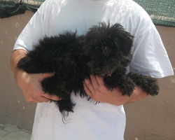 Vor Ort bemüht man sich nun um ihn, und da steht an erster Stelle füttern, füttern und noch einmal füttern. Durch die lange Hungerperiode kann sein kleiner Magen nicht allzu viel Nahrung auf einmal aufnehmen, und so wird er nach Welpenart drei- bis viermal täglich in kleinen Portionen aus der Hand gefüttert. Dies ist machbar, wenn auch schwierig in so einem unruhigen Umfeld, wo die paar Helfer dort viel zu viele Hunde betreuen müssen.