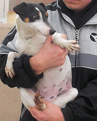 Jolene hatte es bisher in ihrem kurzen Leben nicht leicht - sie wurde an einer Kette, einem Strick oder dergl. gehalten und hatte nur einen eng begrenzten Bewegungsspielraum - wir vermuten, dass sie zur Bewachung von einem Hühnerstall oder ähnlichem eingesetzt wurde. Jolene hatte schwerste Markierungen dieser gemeinen Hundehaltung an ihrem Hals - glücklicherweise war alles "nur" wund gescheuert, nichts eingewachsen oder in tiefere Schichten des Körpers eingedrungen. Fell wächst nach - im nächsten Fellwechsel wird Jolene so schön aussehen, wie sie auch ist.