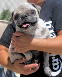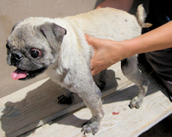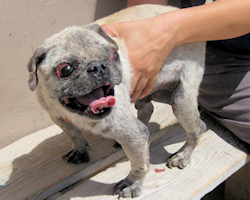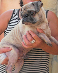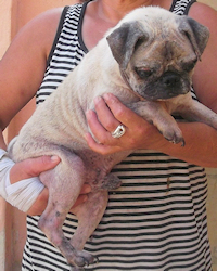 Er ist ein ganz armer kleiner Mops - obwohl er noch so jung ist, hat er doch schon viel gelitten. Seine Augen sind schlecht, seine Muskulatur ist unterentwickelt und möglicherweise hat er auch noch Leishmaniose, der arme. Solche gesundheitlichen Probleme in jungen Jahren bekommt ein Hund in der Regel nur verursacht durch schlechte Haltung, hier höchstwahrscheinlich in einem dunklen Keller. Er muss bei "Barbaren" gefangen gewesen sein, die ihn in dem Moment in einem großen Tierasyl einfach abgaben, als sie mögliche Tierarztkosten zu befürchten hatten - wie grausam ist das denn?